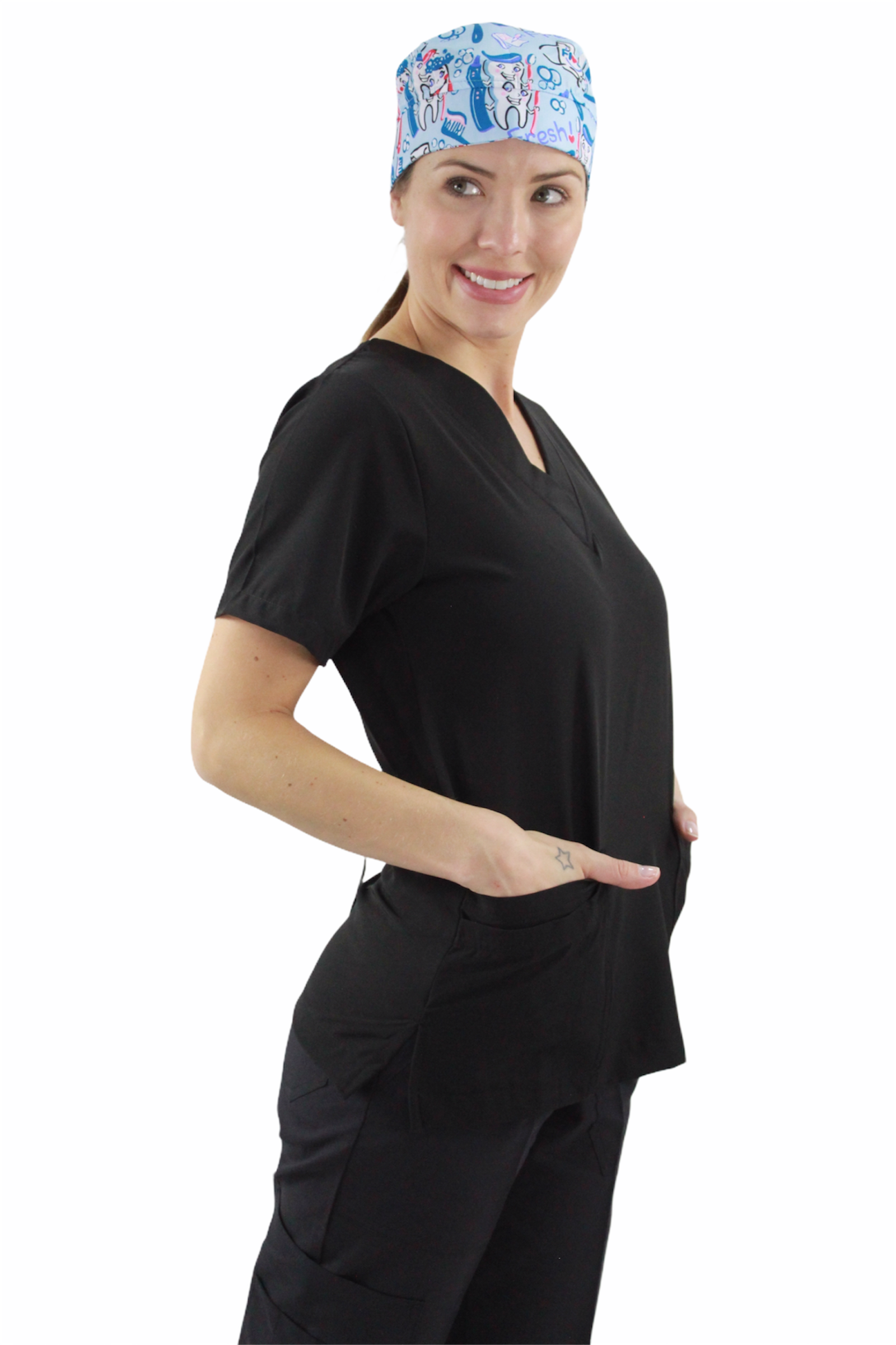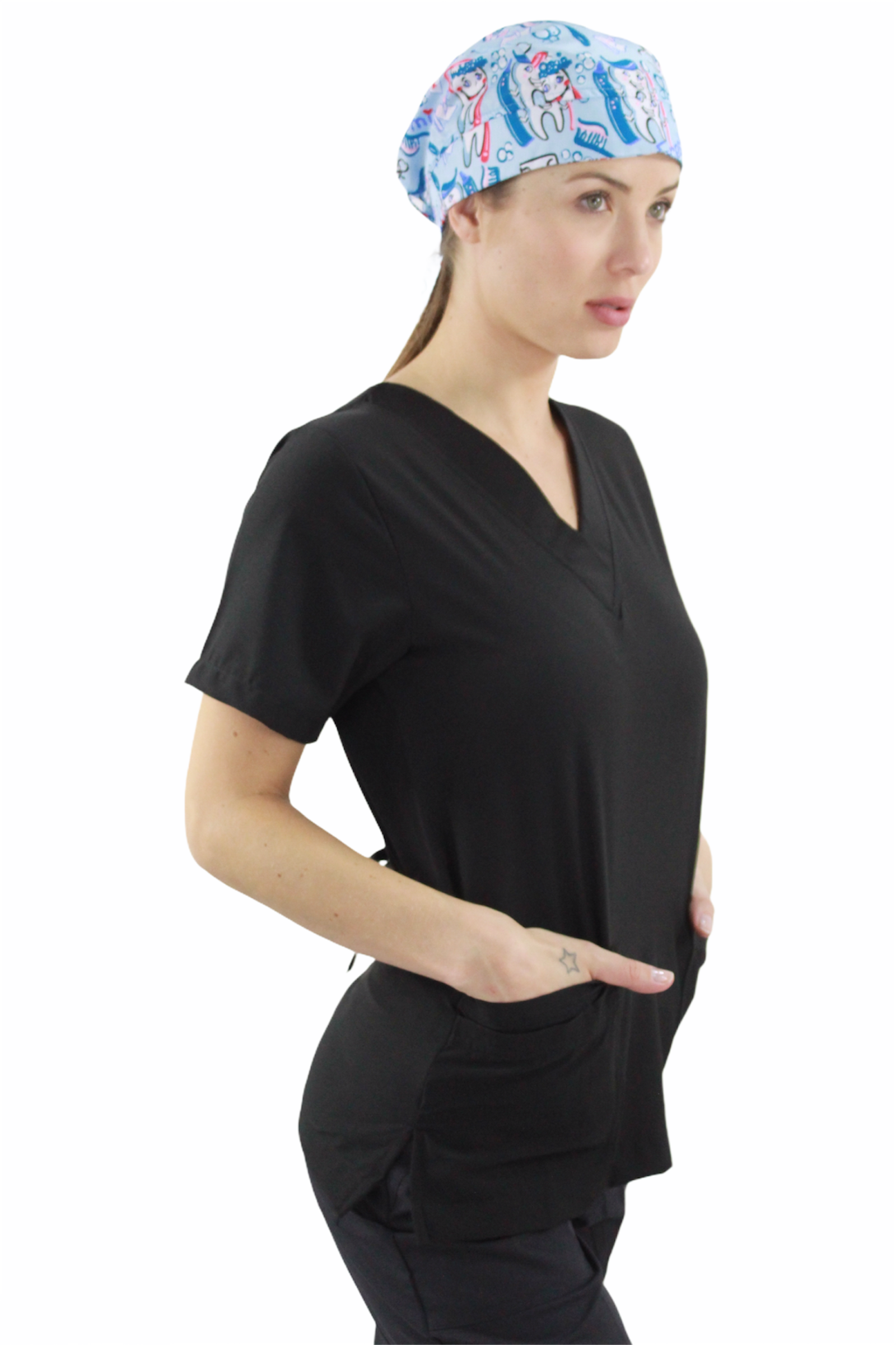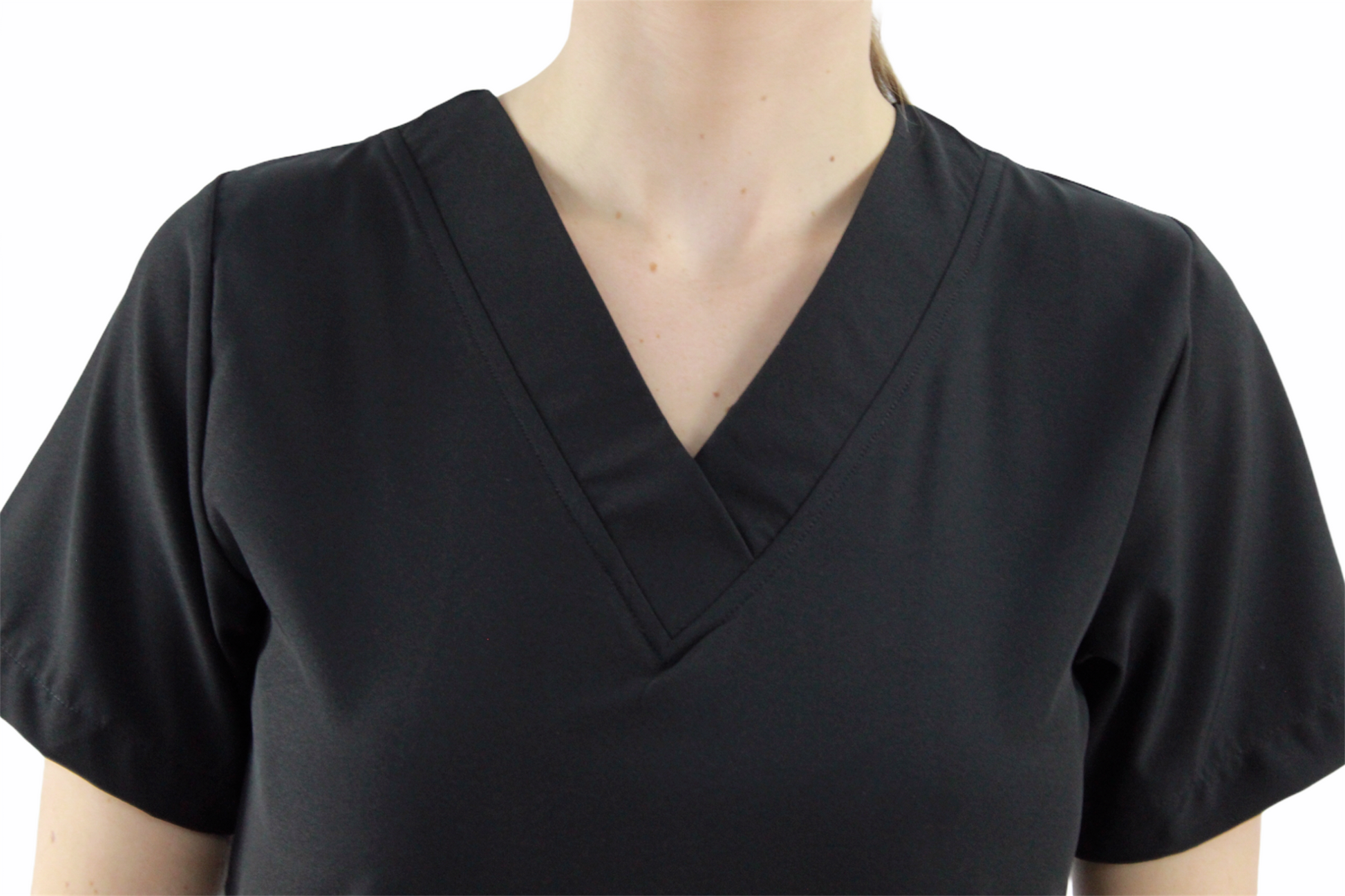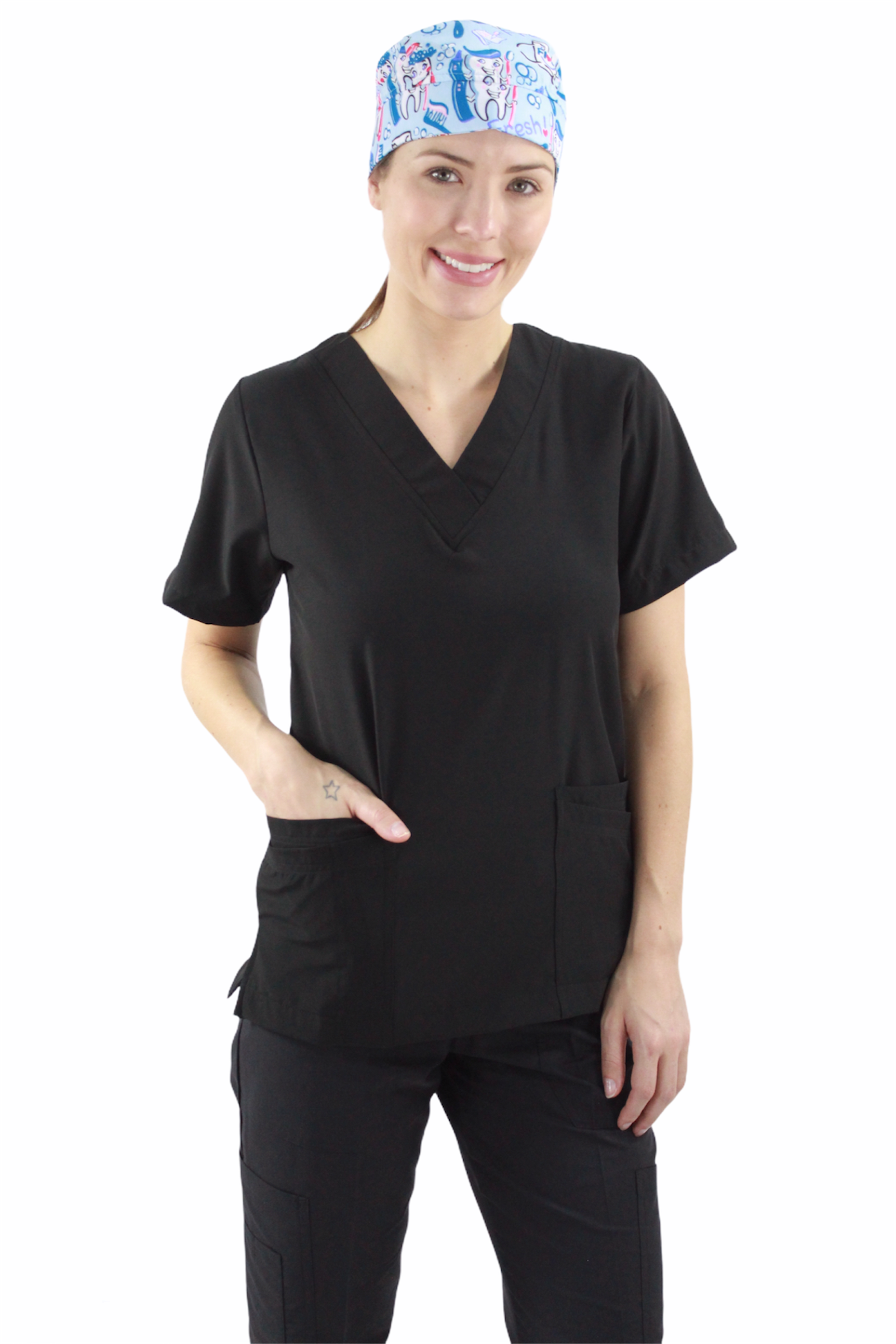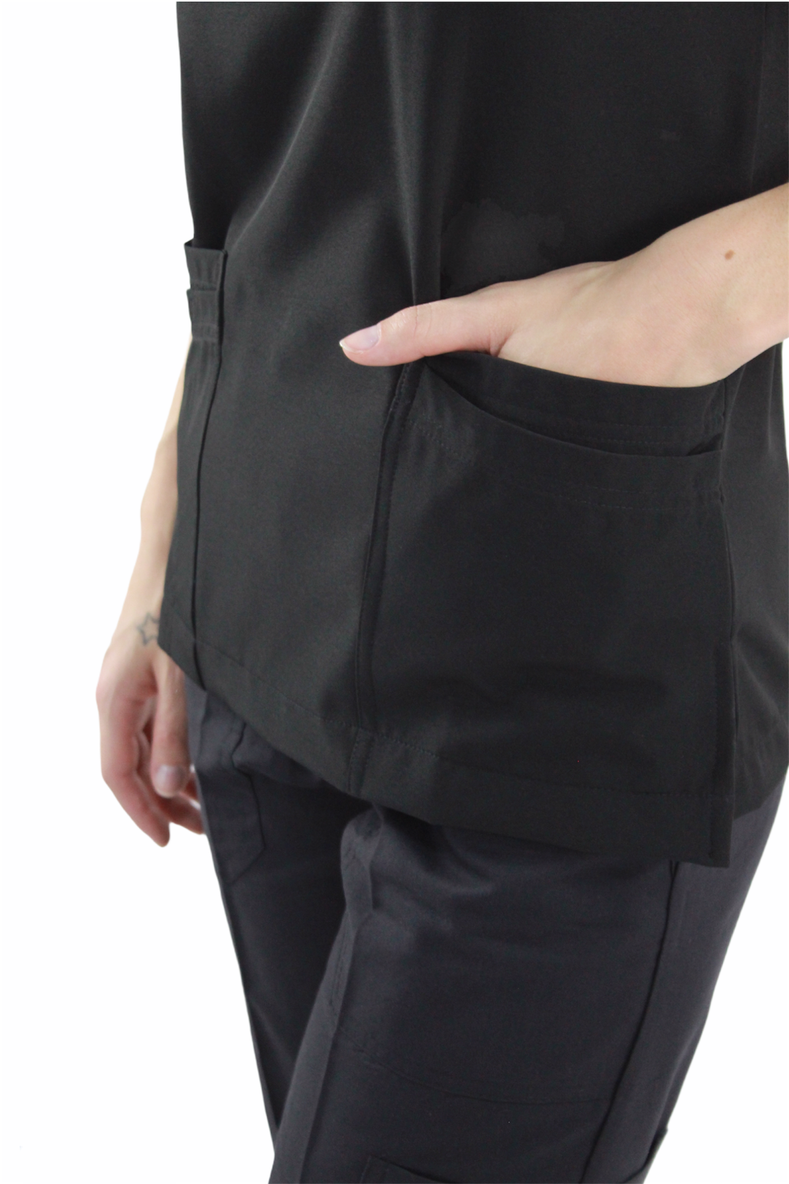 Filipina cuello en V con 4 bolsas en la parte delantera, aberturas en los costados para facilidad de movimiento