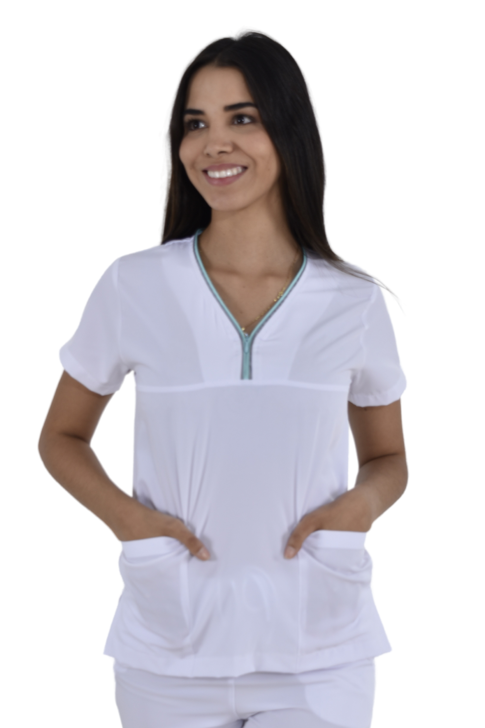 Filipina corte SLIM con escote en "V" con cierre de color, cuenta con 2 bolsas en la parte delantera, aberturas en los costados para facilidad de movimiento, tiene 2 pinzas en la parte de la espalda para brindar un mejor ajuste.