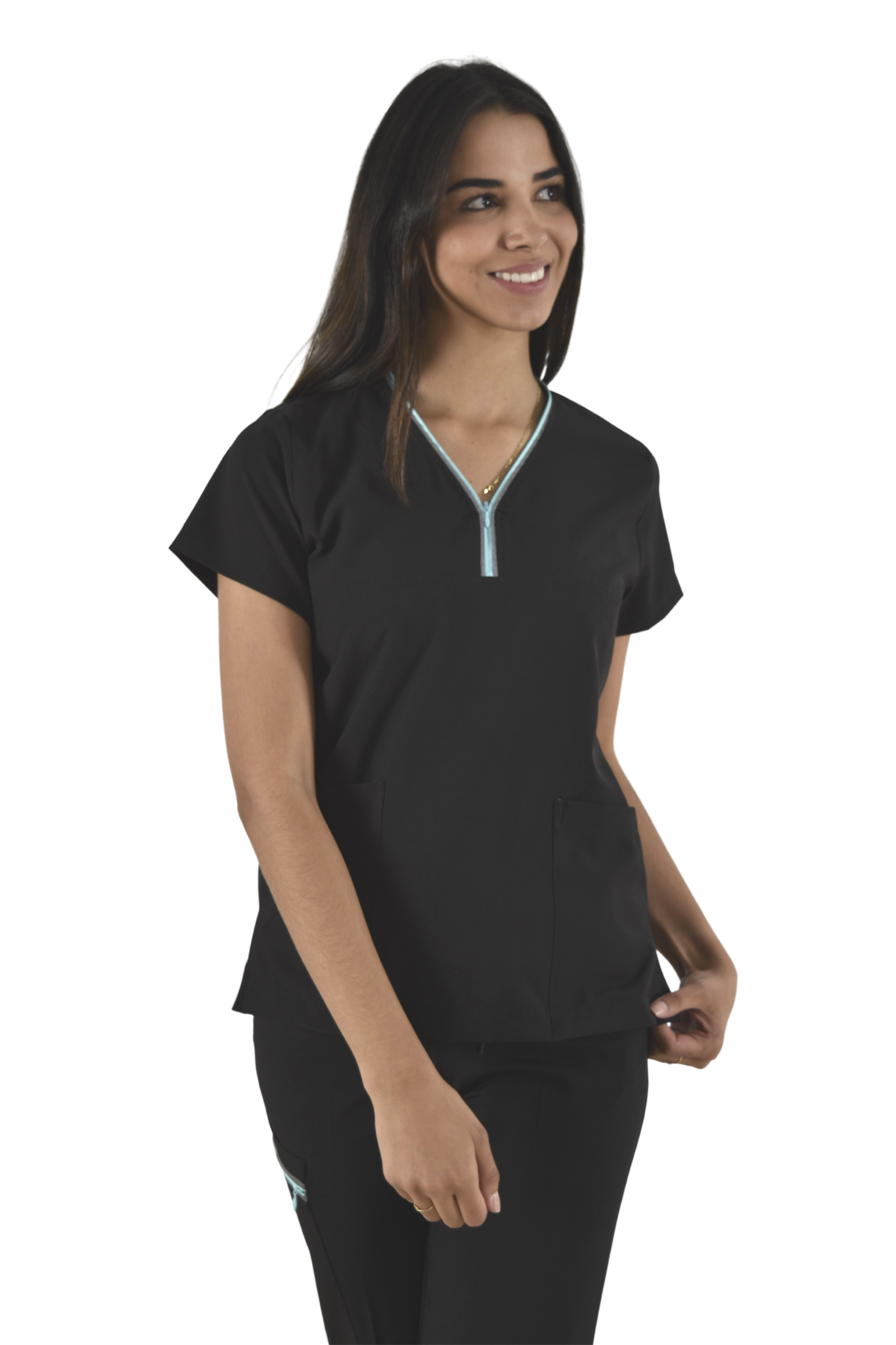 Filipina cuello en V con 2 bolsas en la parte delantera, aberturas en los costados para facilidad de movimiento