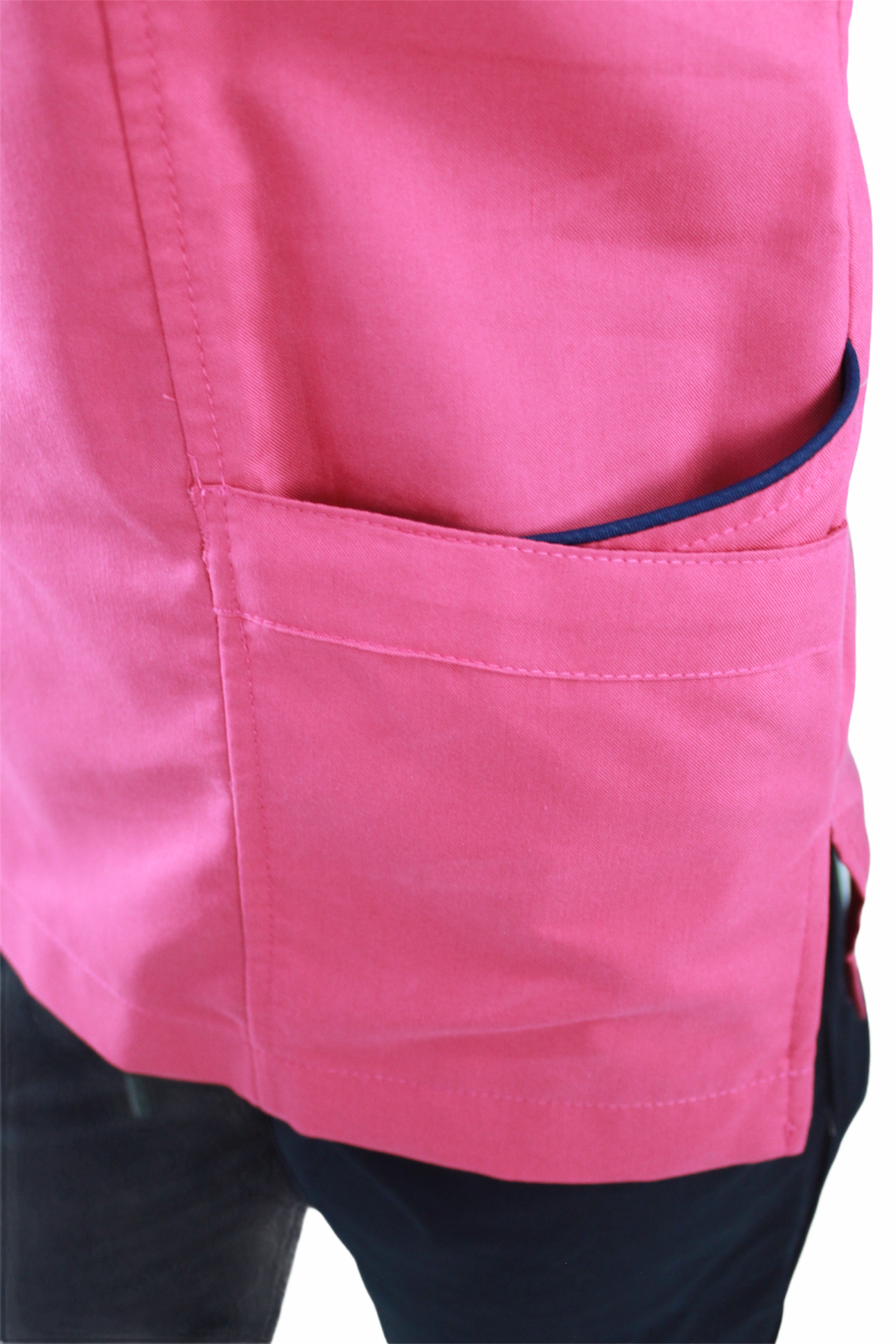 Filipina corte slim fit con escote en "V" con vivos de color en cuello y bolsas, cuenta con 4 bolsas en la parte delantera, aberturas en los costados para facilidad de movimiento, tiene 2 pinzas en la parte de la espalda para brindar un mejor ajuste.