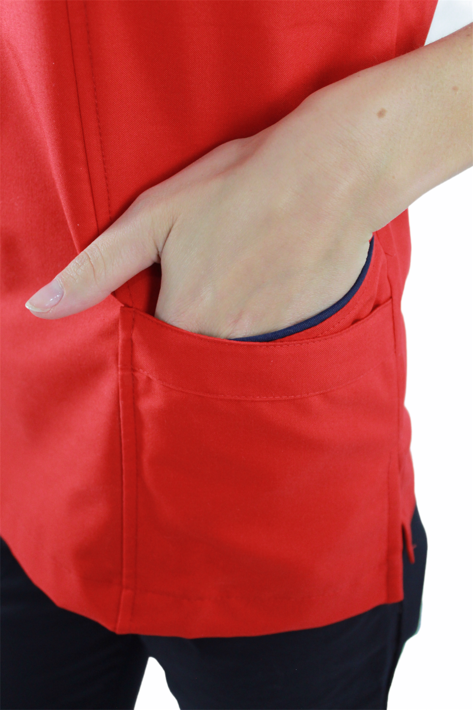 Filipina corte slim fit con escote en "V" con vivos de color en cuello y bolsas, cuenta con 4 bolsas en la parte delantera, aberturas en los costados para facilidad de movimiento, tiene 2 pinzas en la parte de la espalda para brindar un mejor ajuste.