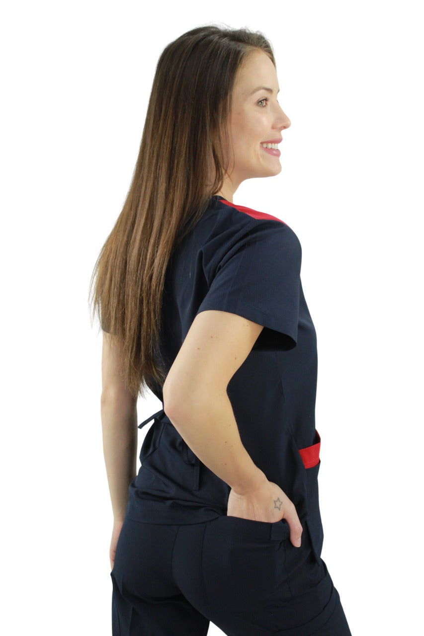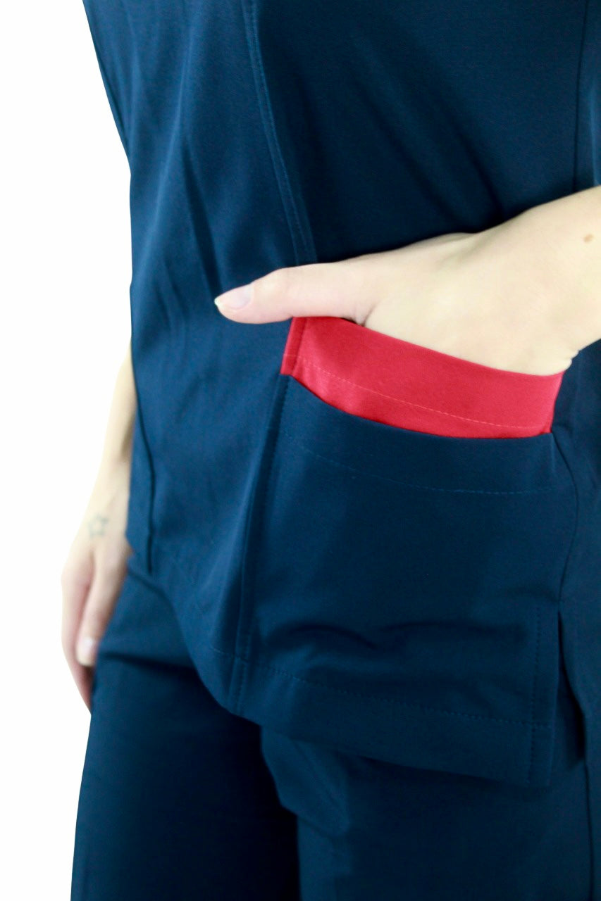 Filipina cuello en V con 4 bolsas en la parte delantera, aberturas en los costados para facilidad de movimiento