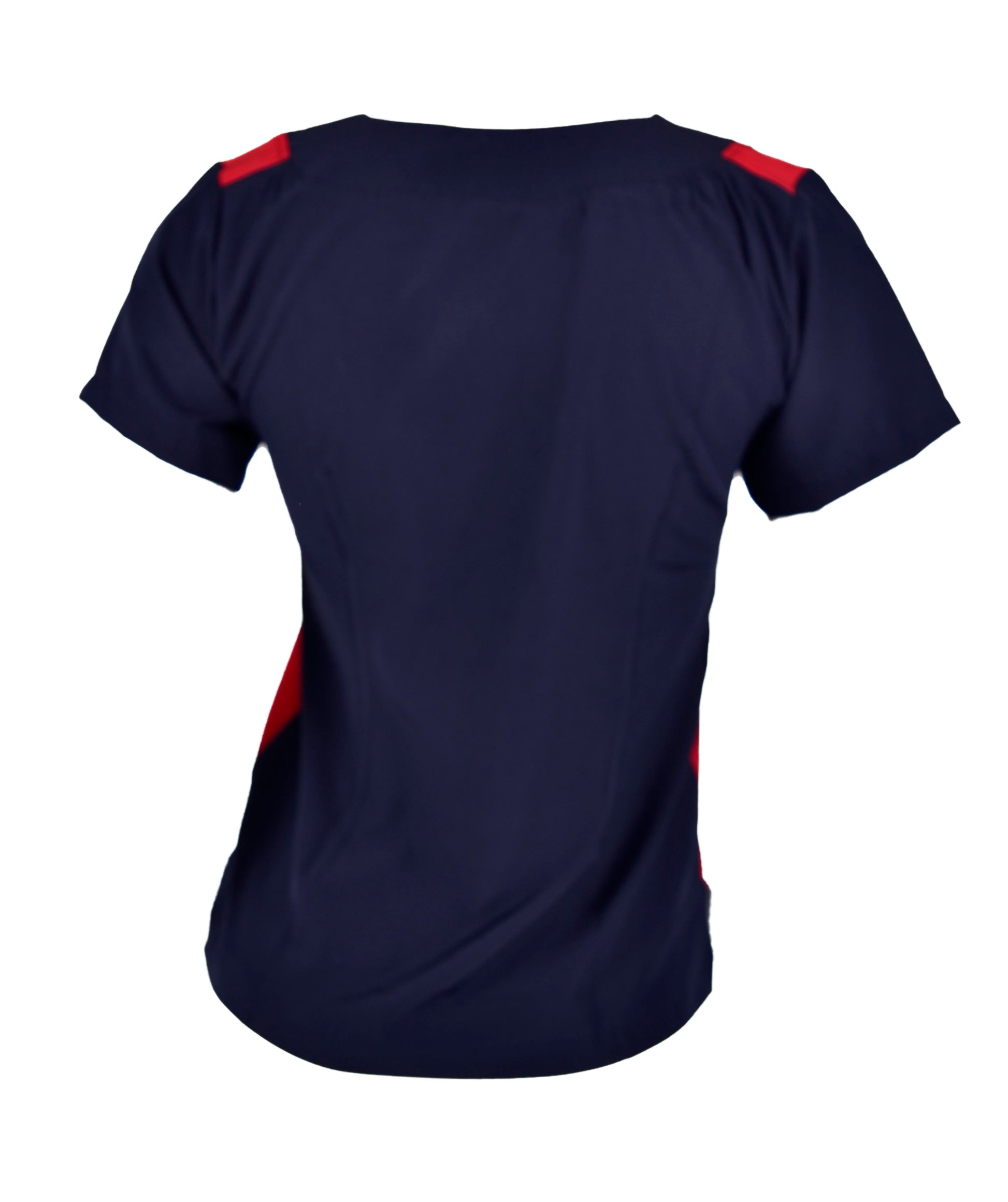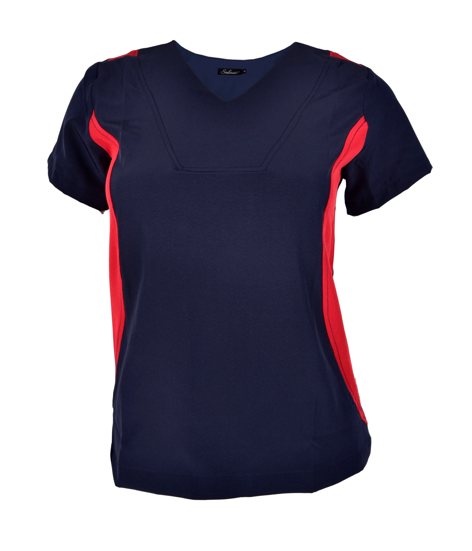 Filipina cuello en V con contraste de color en rojo, cuenta con 2 bolsas en la parte delantera ocultas entre el corte de color.