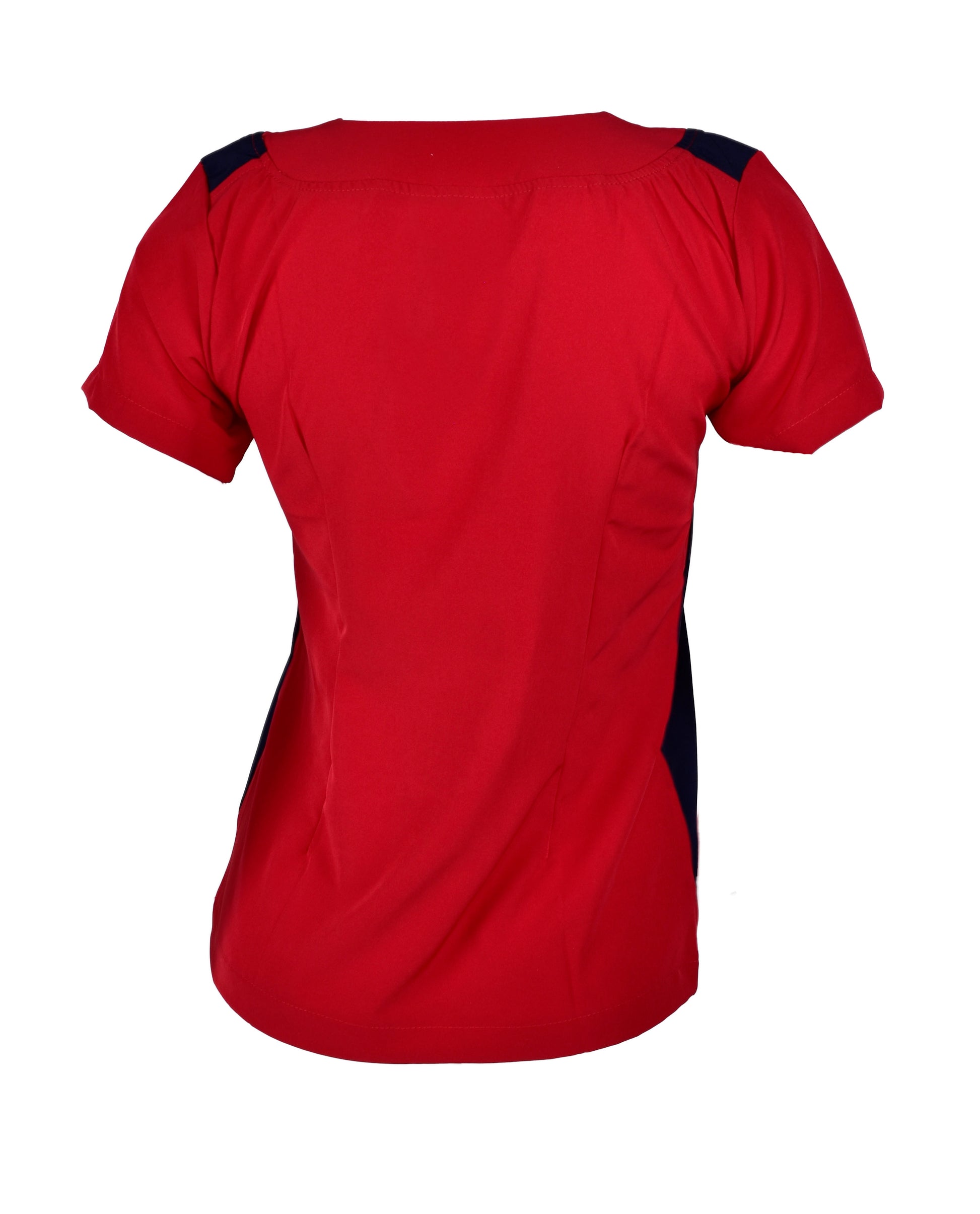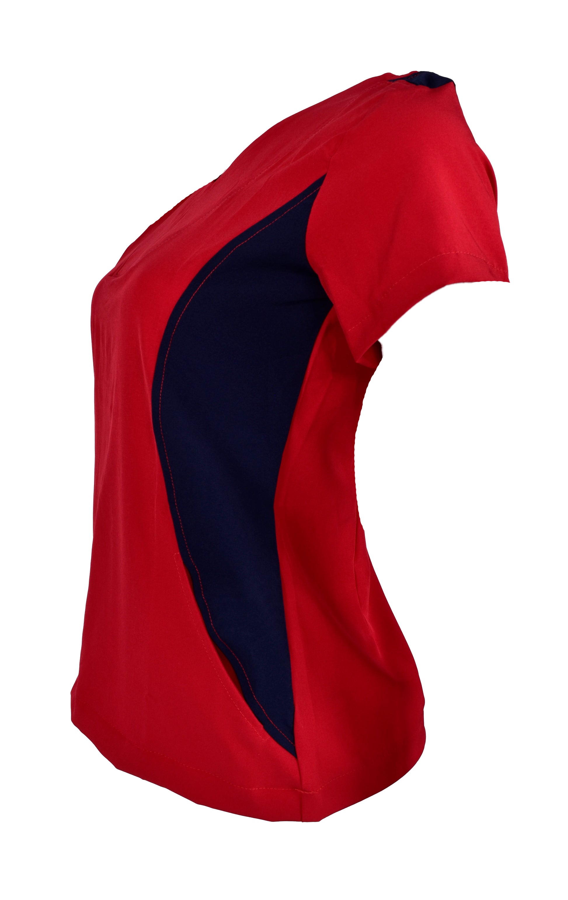 Filipina cuello en V con contraste de color en azul marino, cuenta con 2 bolsas en la parte delantera ocultas entre el corte de color.