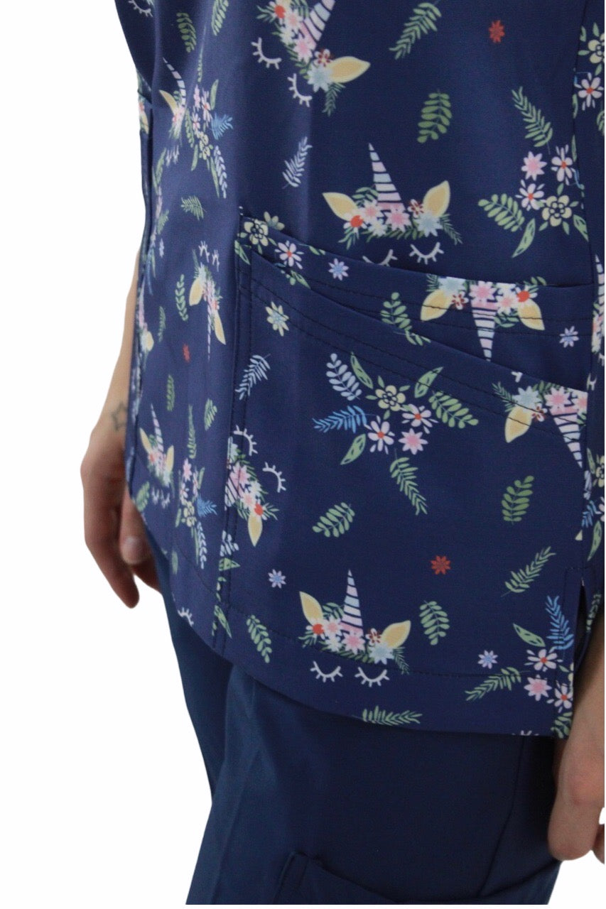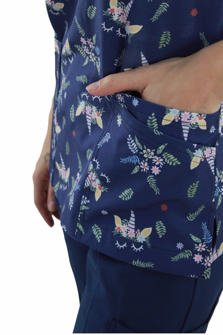 Filipina cuello en V con 4 bolsas en la parte delantera, aberturas en los costados para facilidad de movimiento y jareta en la espalda para un mejor ajuste.