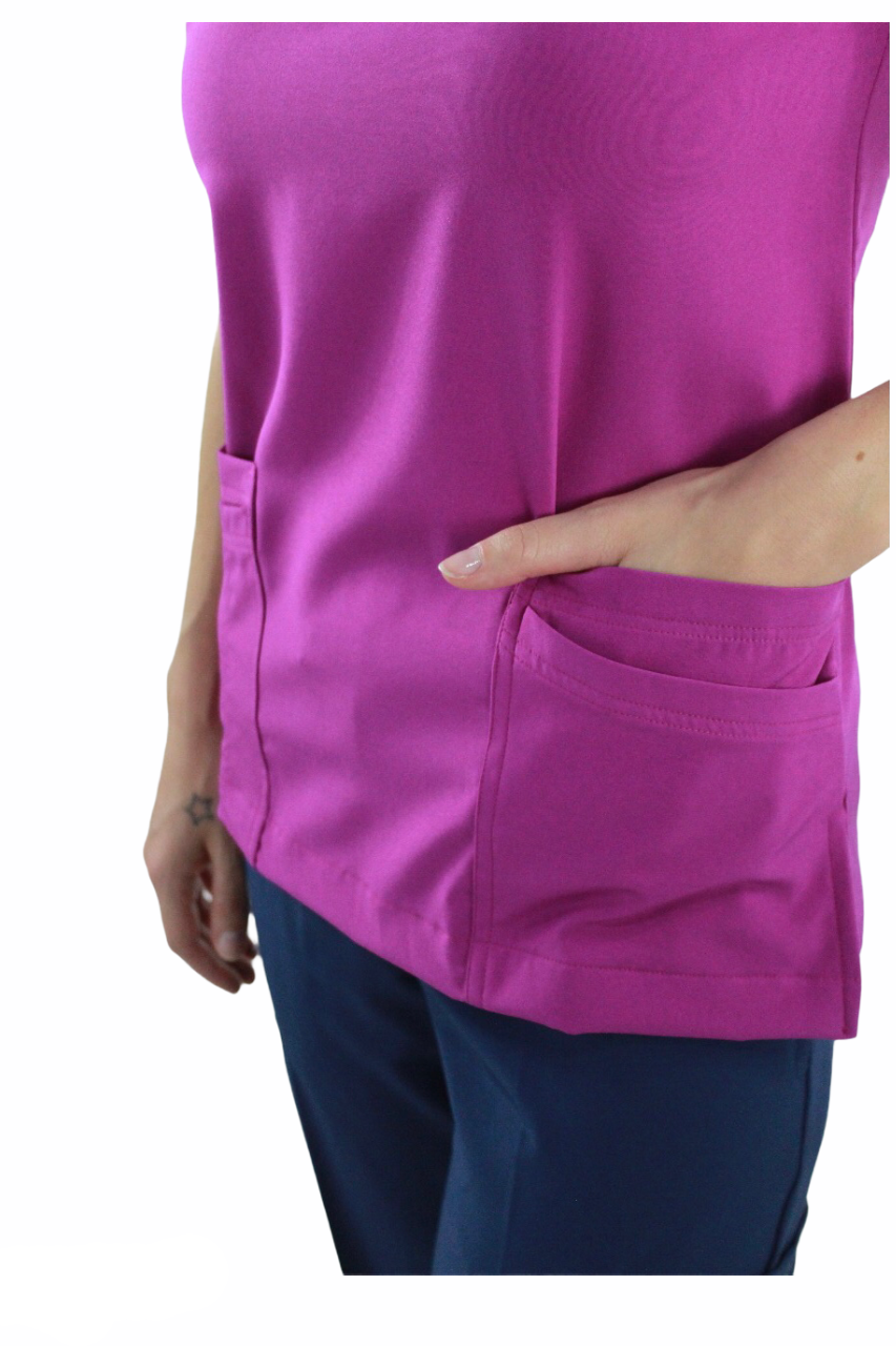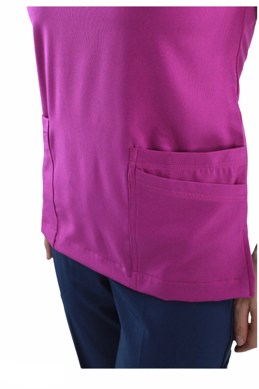 Filipina cuello en V con 4 bolsas en la parte delantera, aberturas en los costados para facilidad de movimiento