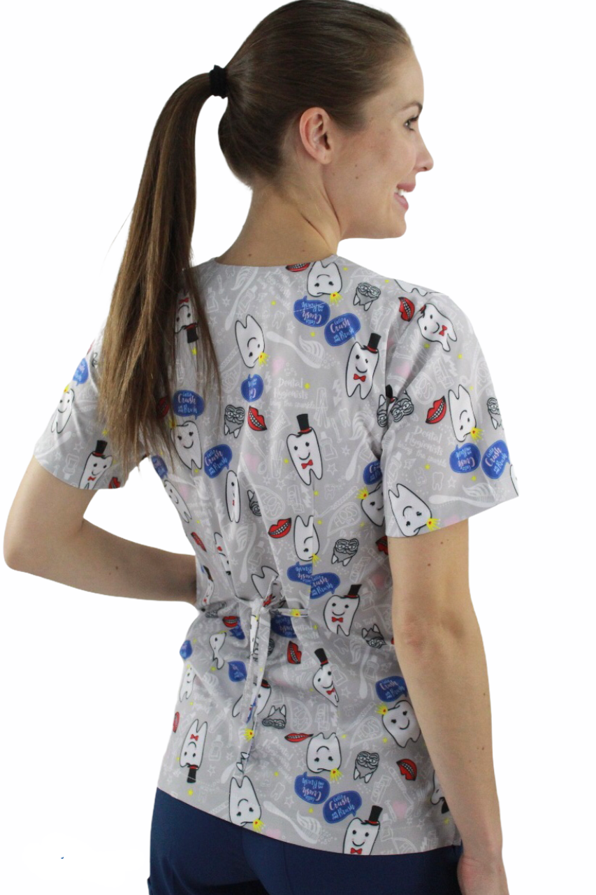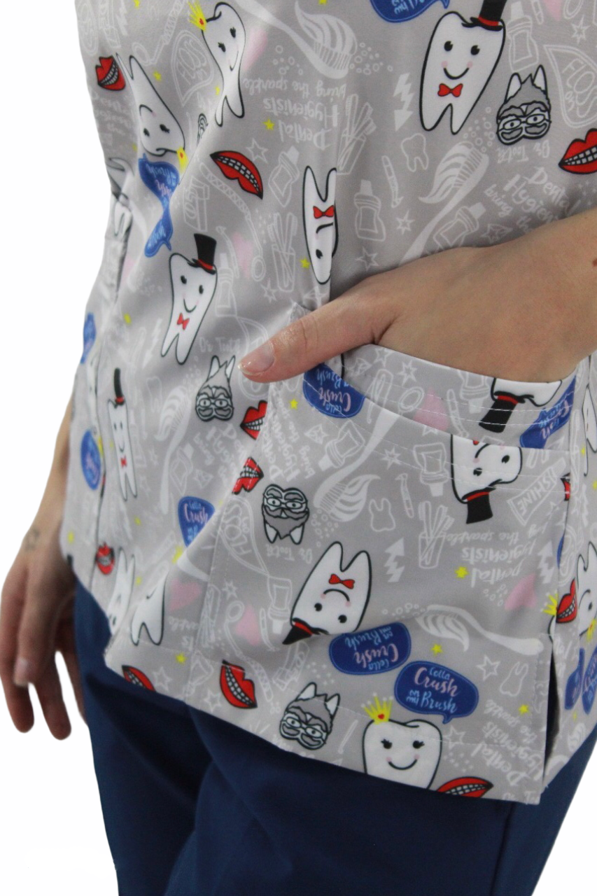 Filipina cuello en V con 4 bolsas en la parte delantera, aberturas en los costados para facilidad de movimiento y jareta en la espalda para un mejor ajuste.