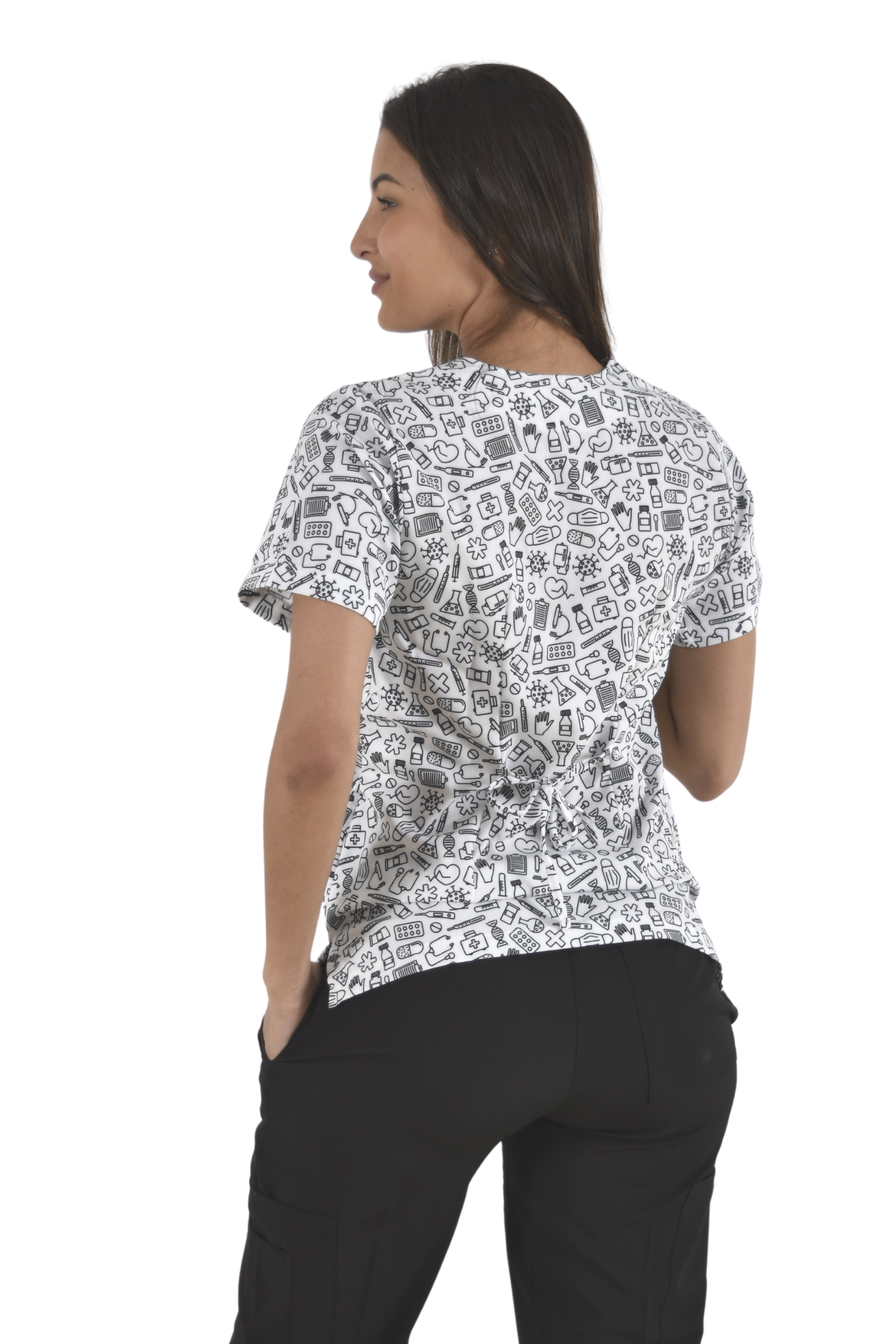 Filipina cuello en V con 4 bolsas en la parte delantera, aberturas en los costados para facilidad de movimiento y jareta en la espalda para un mejor ajuste.