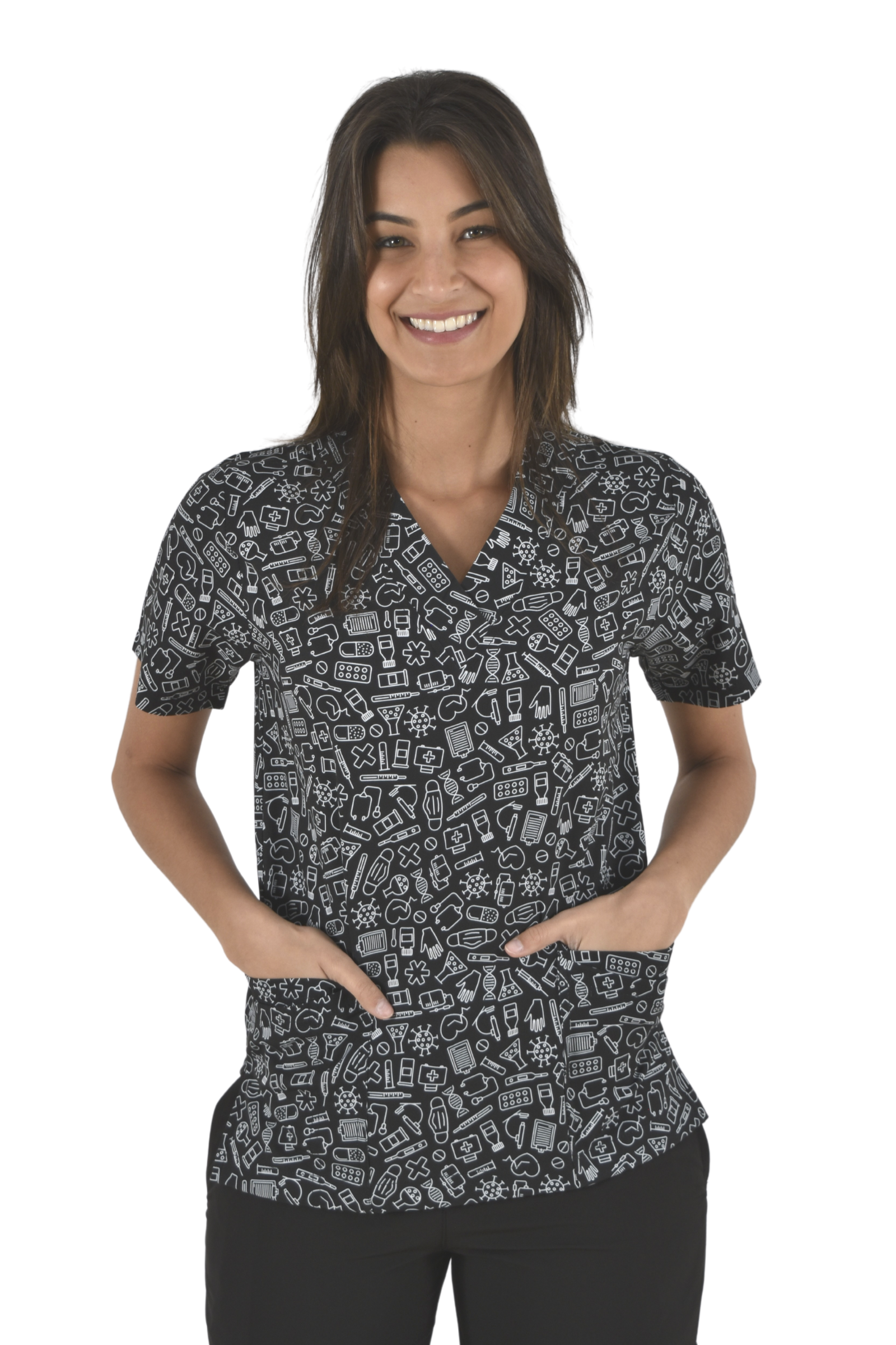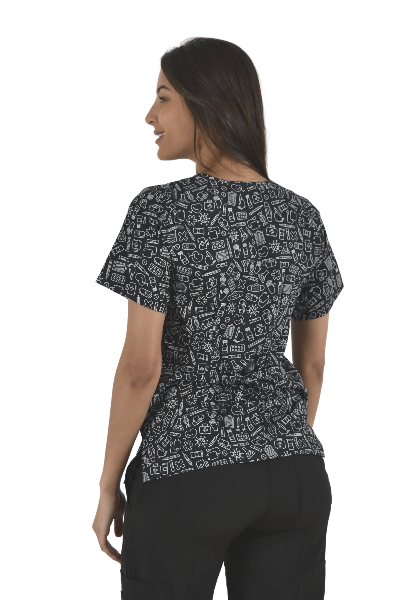 Filipina cuello en V con 4 bolsas en la parte delantera, aberturas en los costados para facilidad de movimiento y jareta en la espalda para un mejor ajuste.