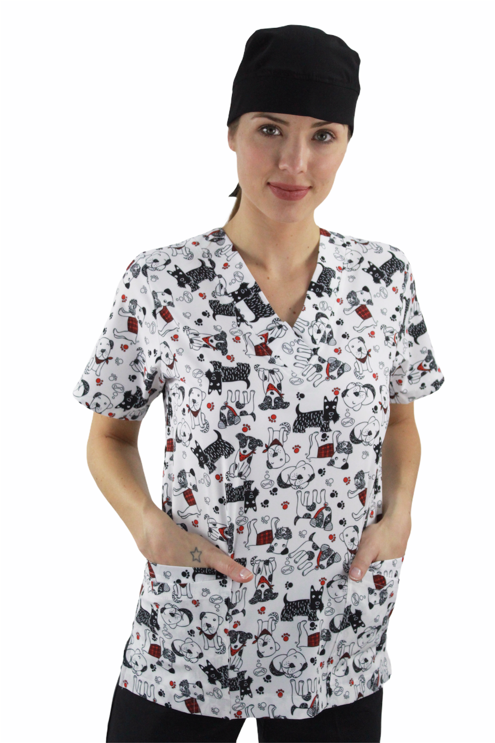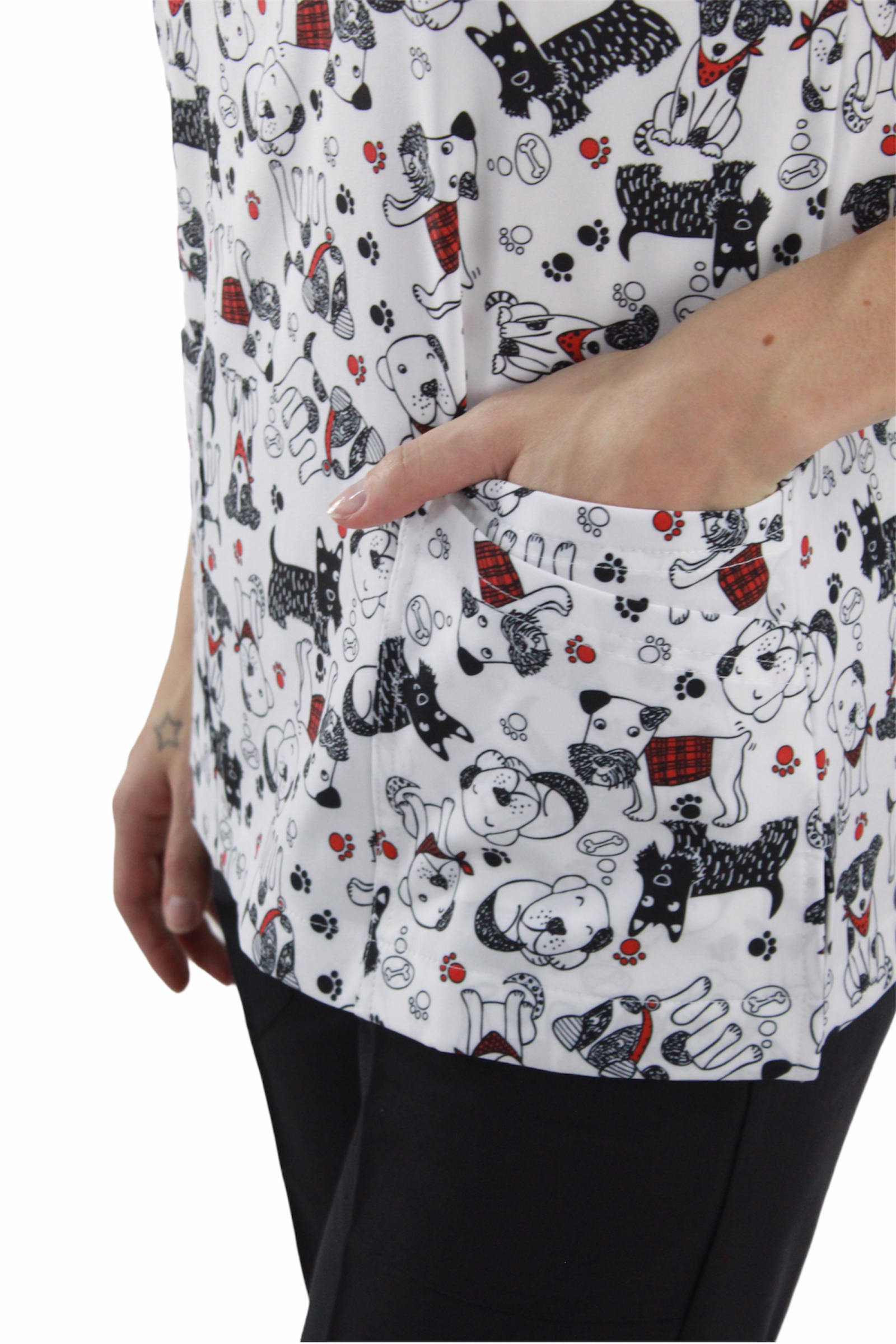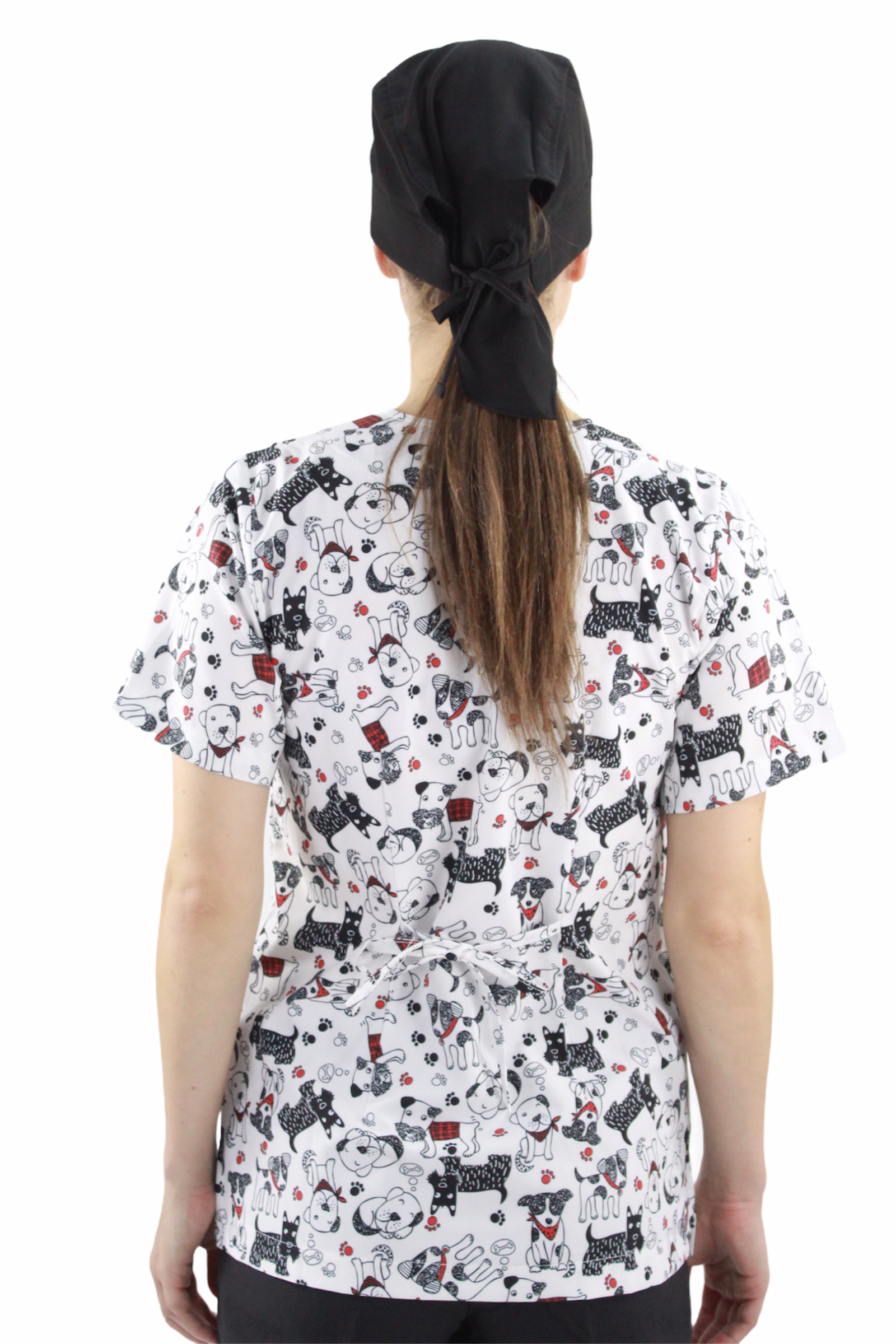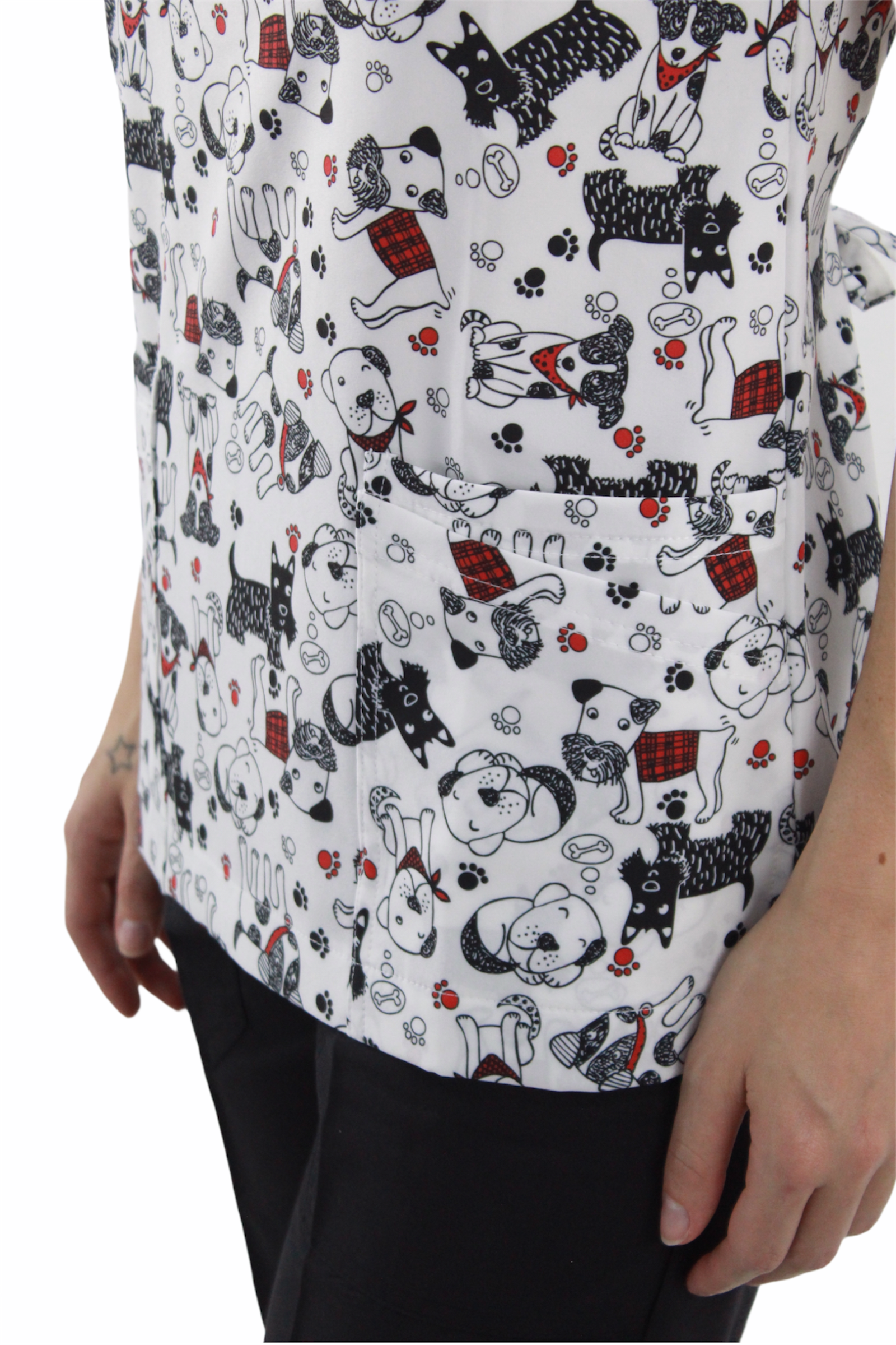 Filipina cuello en V con 4 bolsas en la parte delantera, aberturas en los costados para facilidad de movimiento y jareta en la espalda para un mejor ajuste.