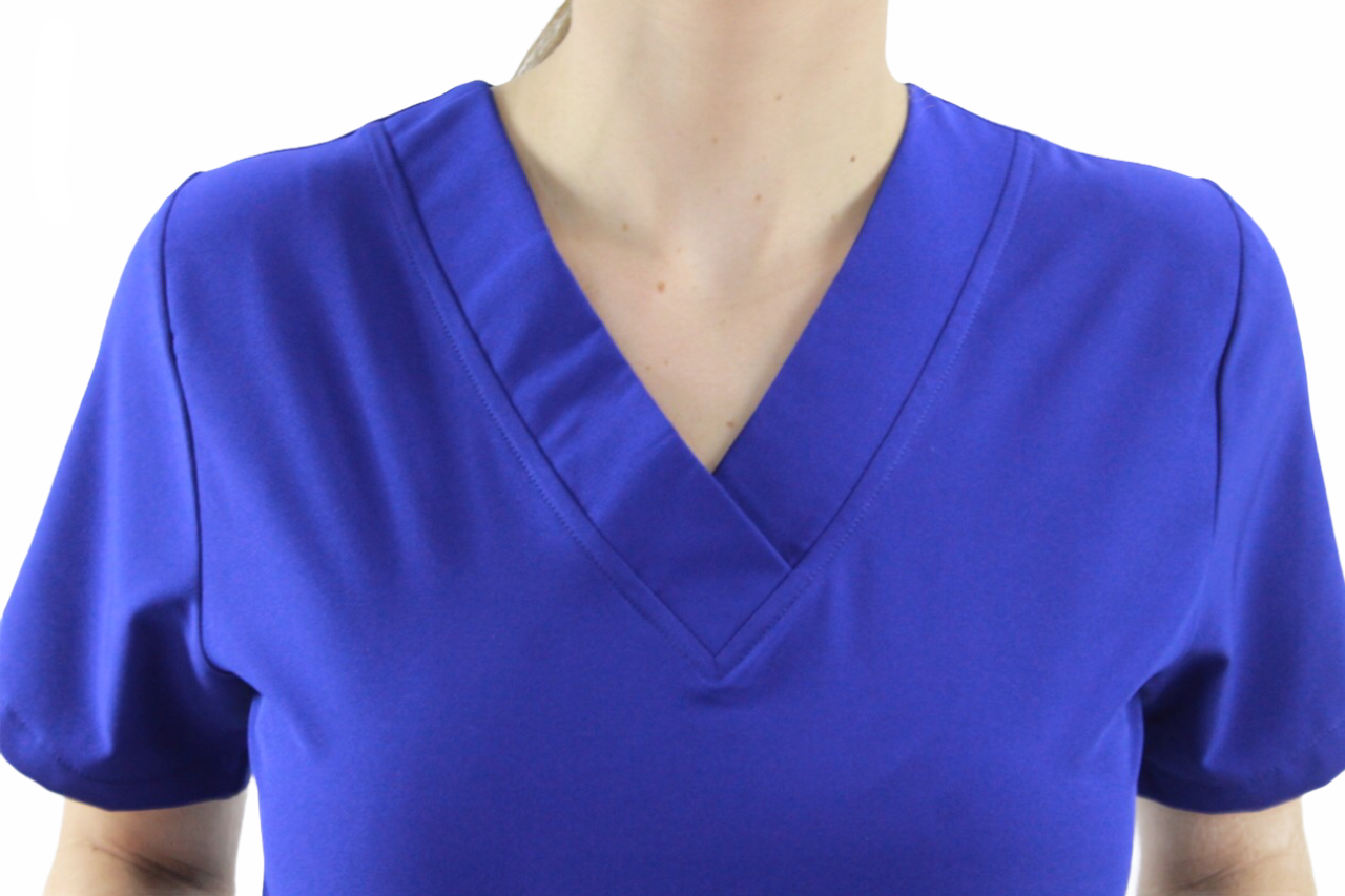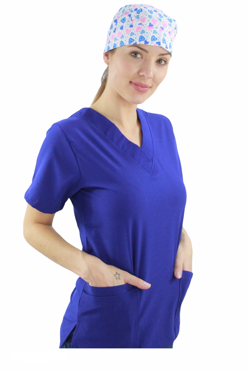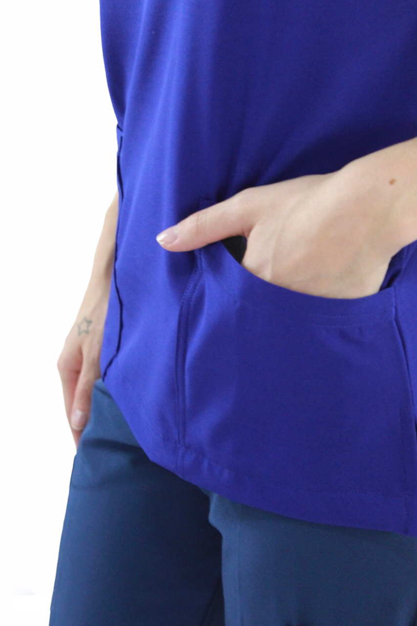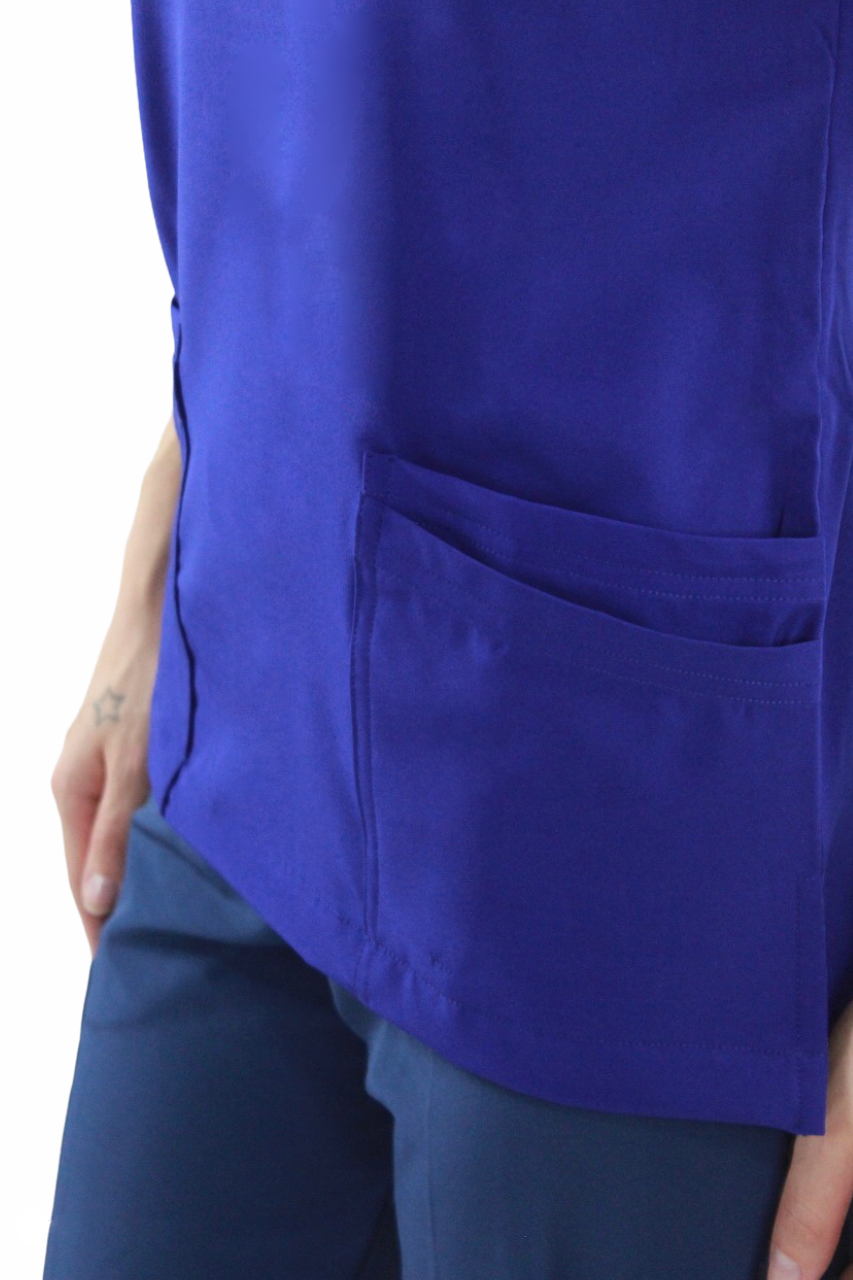Filipina cuello en V con 4 bolsas en la parte delantera, aberturas en los costados para facilidad de movimiento